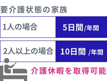 要介護状態にある家族を介護する1人であれば5日間/年間、2人以上であれば10日間/年間の介護休暇を取得ができます。